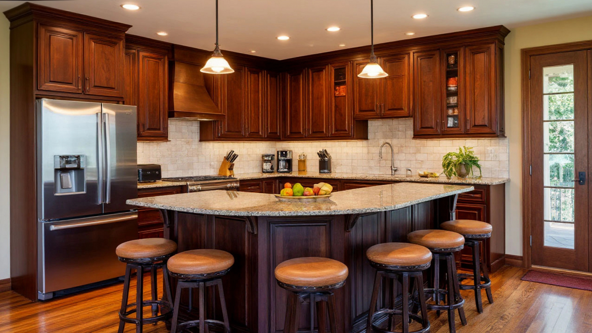 Фасады кухни выполнены из высококачественных материалов, обеспечивающих долговечность, устойчивость к влаге и механическим воздействиям. Барная стойка, являясь центральным элементом, сочетает эстетическую привлекательность с практичностью: поверхность легко очищается, устойчива к пятнам и температурным перепадам, а насыщенный коричневый цвет добавляет интерьеру глубину и благородство. Металлические детали техники — плита, вытяжка, раковина, посудомоечная машина — идеально гармонируют с фасадами, создавая визуальный баланс и подчеркивая современность кухни.
