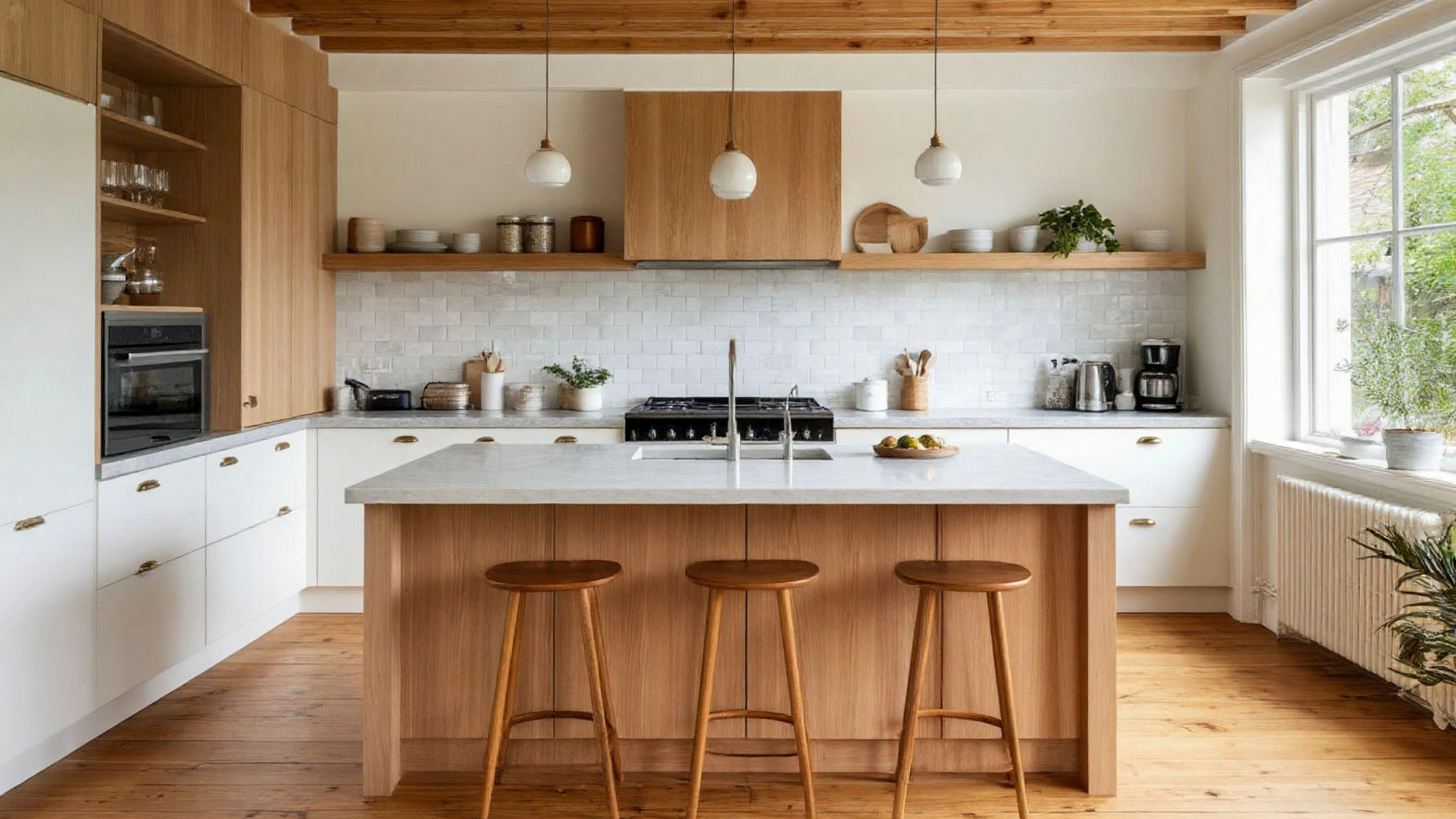 Светлые фасады кухни отражают свет, визуально расширяют пространство и создают атмосферу лёгкости. Натуральное дерево и современные материалы придают интерьеру тепло и уют. Остров, расположенный в центре, становится не только функциональной зоной, но и декоративным элементом, подчеркивающим стиль кухни. Каждая деталь, включая фурнитуру и аксессуары, продумана для удобства и гармонии интерьера.