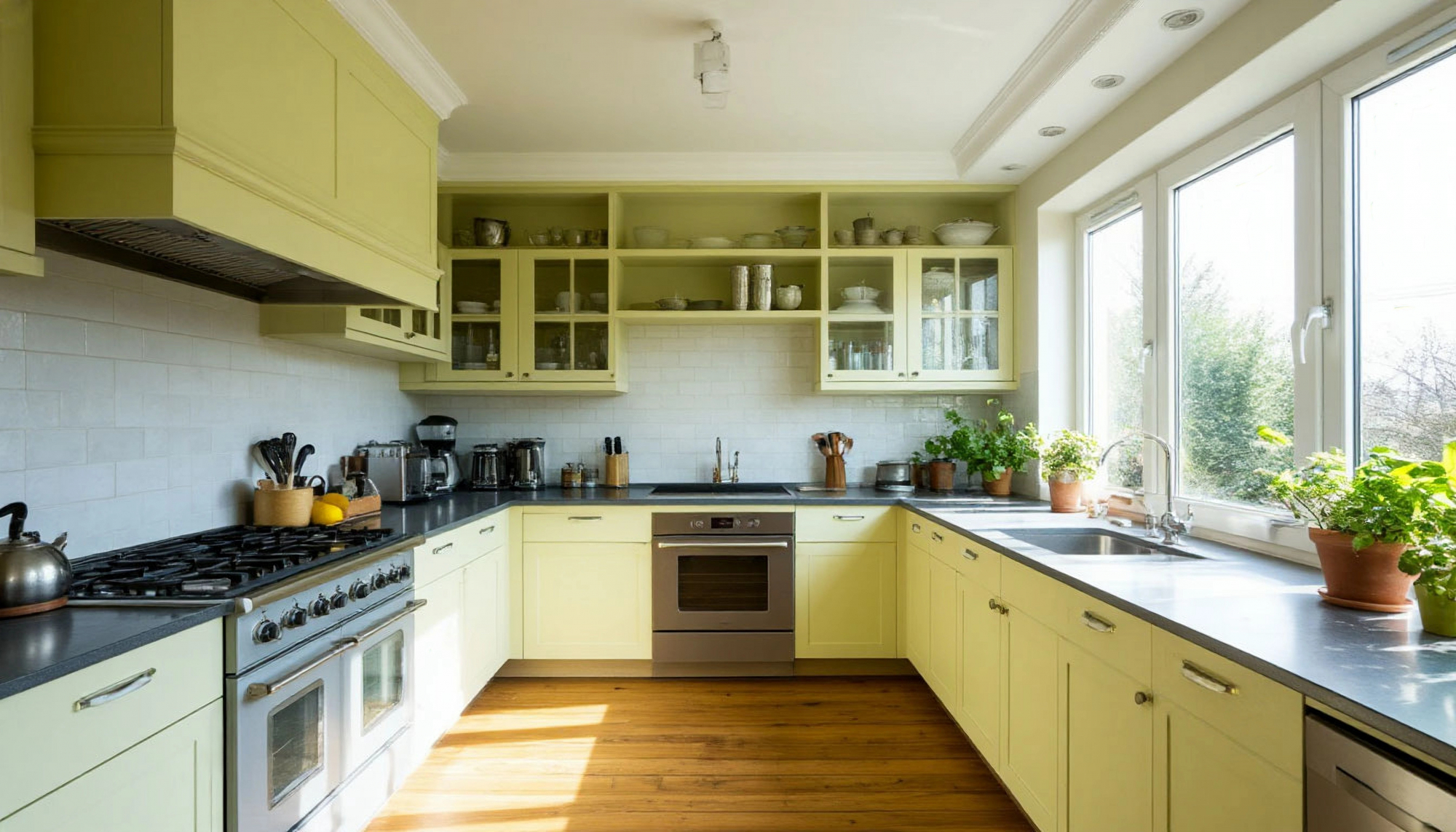 Интересно, что светлый лимонный цвет гармонично сочетается с множеством материалов. Он прекрасно смотрится с деревом — особенно с натуральными фактурами дуба или ясеня. Такие сочетания делают интерьер живым, природным, словно вы находитесь в летнем доме у моря. Если добавить немного белого или молочного — получится ощущение лёгкости и чистоты. А сочетание с графитовым или песочным цветом придаёт кухне современный и благородный вид.
