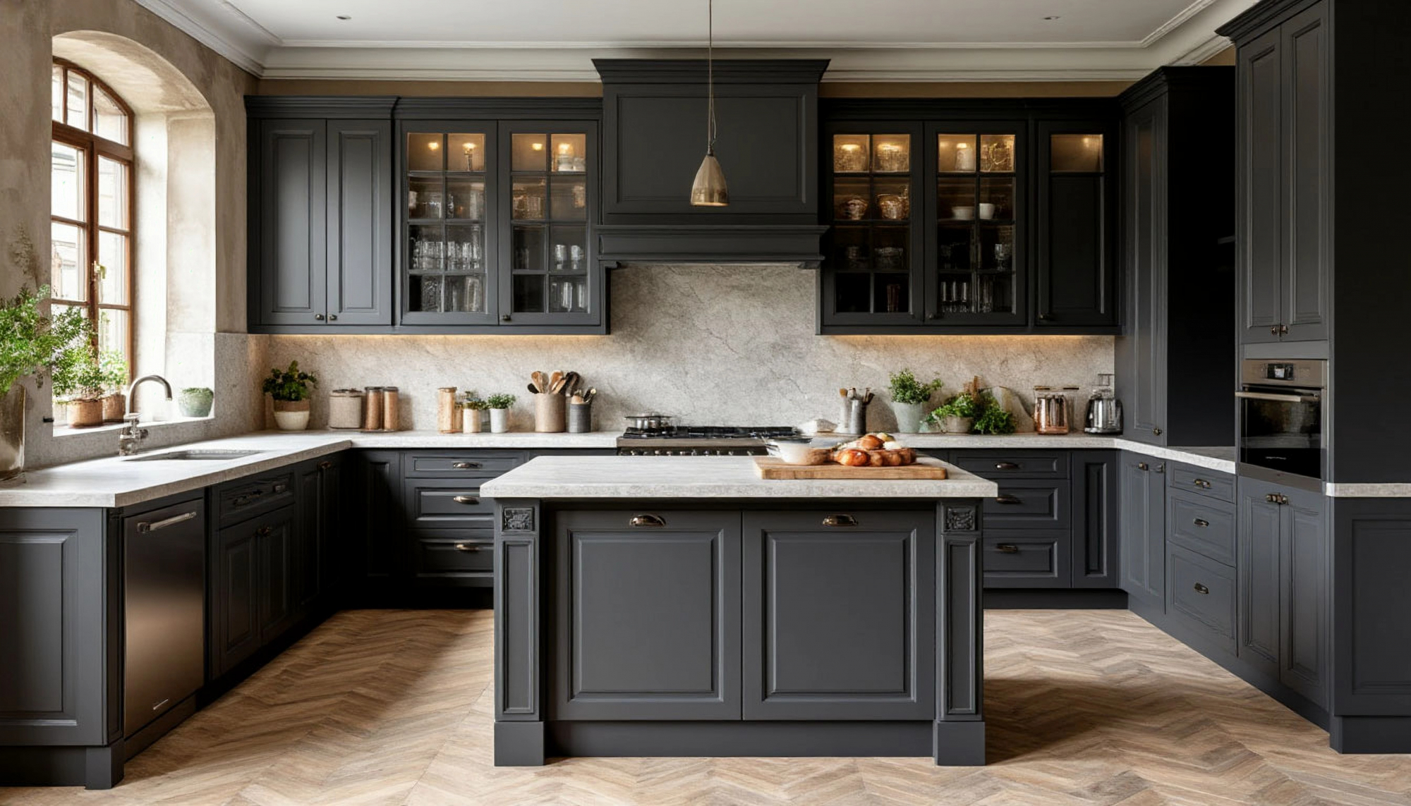 Римский стиль всегда ассоциируется с гармонией пропорций, чувством меры и уважением к классике. Именно такие акценты легли в основу проекта "Тибур". Цвет графит подчеркивает монументальность и стабильность, напоминая о прочных каменных стенах, колоннах и базиликах, которыми славился древний Рим. При этом современное исполнение фасадов делает кухню актуальной и практичной, а гладкая поверхность подчеркивает благородство оттенка. Графитовый цвет здесь работает как основа всего интерьера: он универсален, подходит для разных помещений и легко сочетается как с теплыми, так и с холодными тонами.