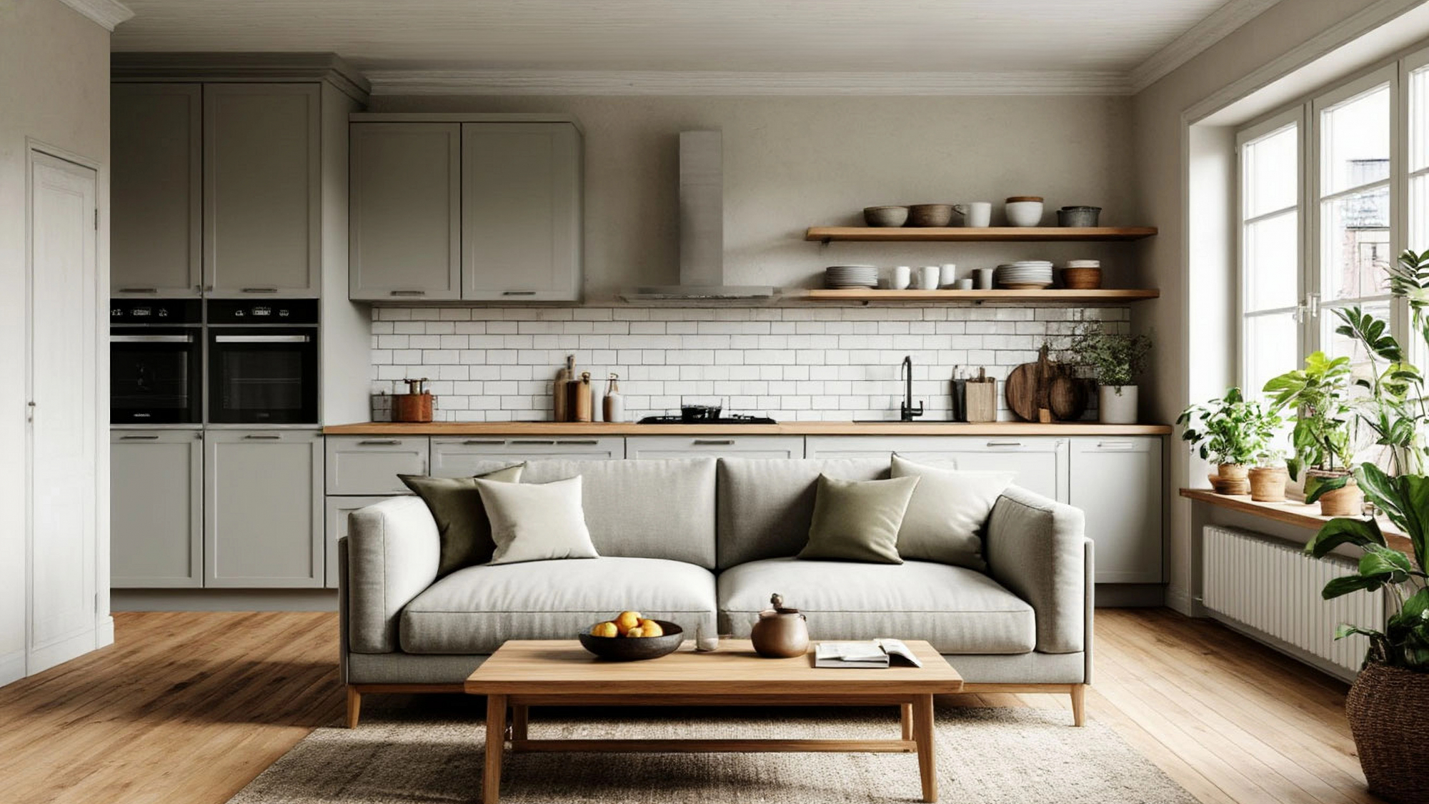 Отдельный акцент — диван. В кухне "Тундра" он занимает особое место: не как случайное дополнение, а как логичная часть композиции. Это не просто необходимость для маленьких квартир, а элемент, который меняет само восприятие пространства. Диван в этом интерьере — знак того, что кухня перестаёт быть исключительно рабочей зоной и становится полноценным центром дома. На нём можно устроить завтраки, посидеть с чашкой чая вечером, поработать за ноутбуком, подождать, пока готовится ужин или спокойно побеседовать с друзьями, пока хозяйка или хозяин наводит порядок. Скандинавский подход к обустройству пространства как раз и заключается в том, чтобы сделать жизнь проще, а моменты — теплее, и диван становится одним из ключевых инструментов для достижения такого эффекта.