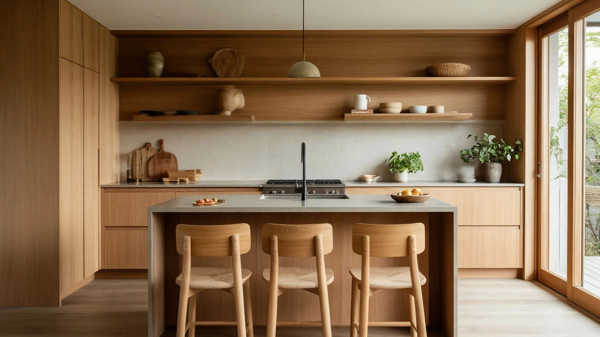Кухня без навесных шкафов в стиле джапанди превращает процесс приготовления пищи в удовольствие, объединяя простоту и эстетику. Открытые пространства можно использовать для размещения растений, красивой посуды или аксессуаров, создавая живую, динамичную атмосферу. Натуральные материалы, спокойные цвета и минимализм формируют гармонию, в которой каждый элемент находится на своём месте, а интерьер остаётся чистым и структурированным.